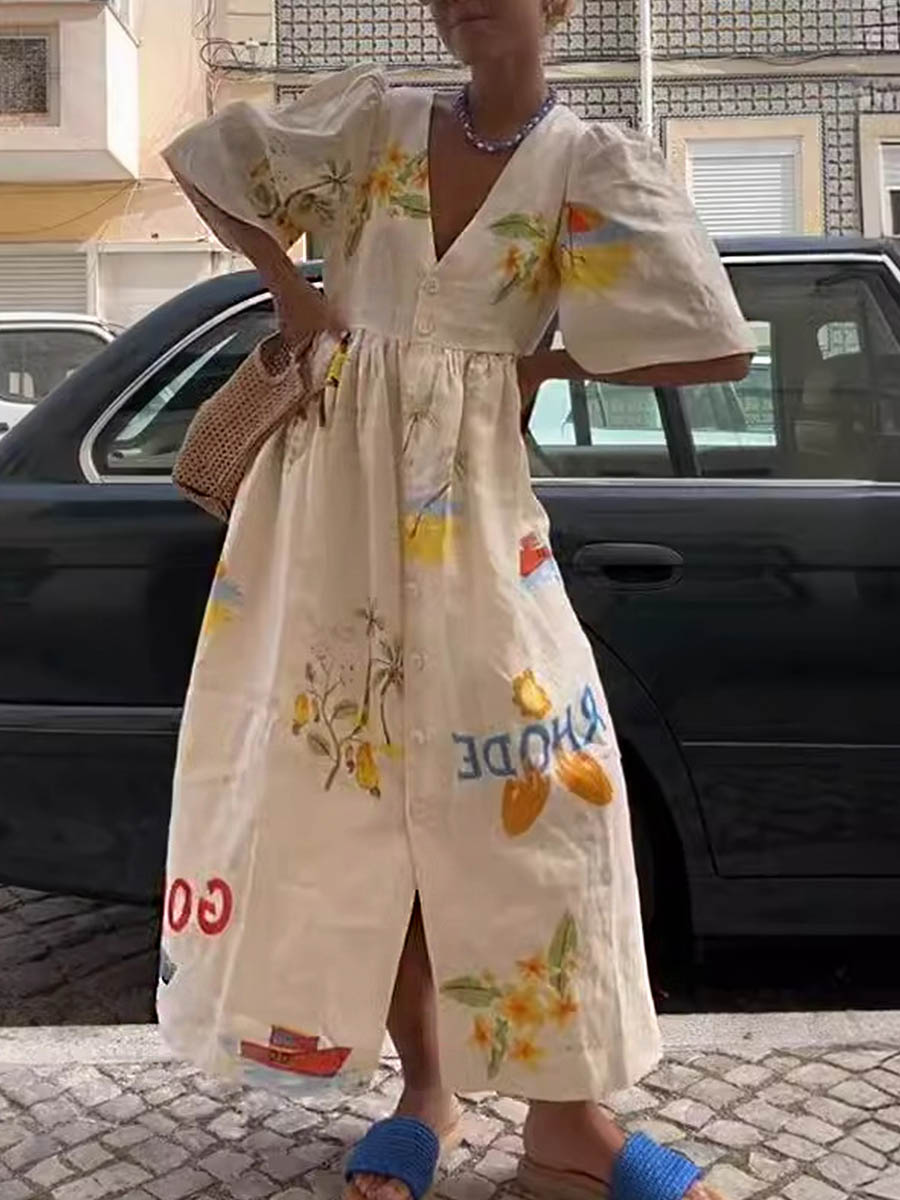 Damska sukienka z krótkim rękawem i dekoltem w serek, wykonana z bawełny i lnu, z nadrukiem