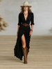 Ta elegancka sukienka maxi wykonana jest z imitacji bawełny i lnu, z plisowaną spódnicą i kołnierzykiem z klapami. Jednorzędowy przód i długie rękawy tworzą elegancki, ponadczasowy look, idealny na różne okazje.