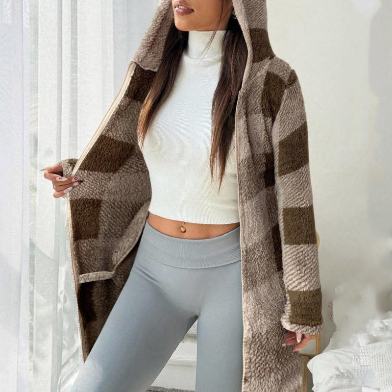 Opakowanie zawiera: 1 x damską kurtkę z kapturem i zamkiem błyskawicznym w kratkę